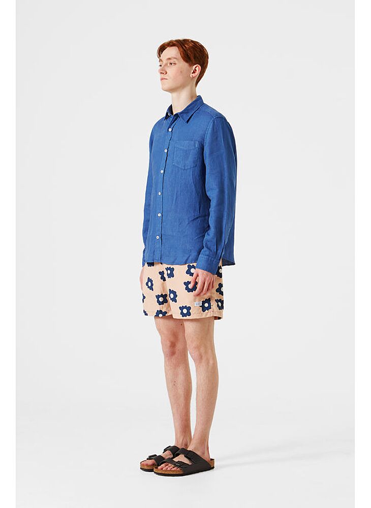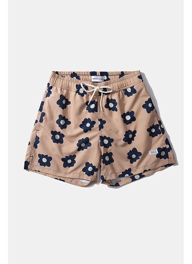 Navy blue swimsuit, with elastic waist and adjustable drawstring. The floral print has been designed in the creative studio in Madrid and manufactured in Portugal.