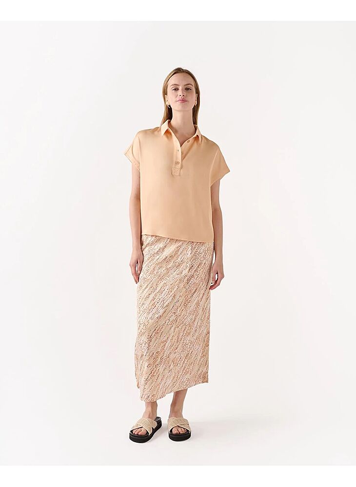 The Juml skirt comes in a structured shiny satin. It has a beautiful small print, a button closure and side slit. The skirt has a midi length, is a-line shaped and is lined.