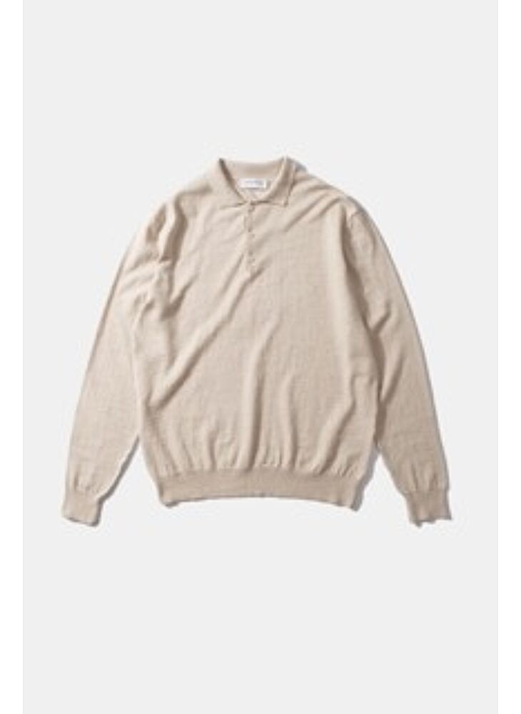 A knitted polo model with long sleeves and buttoned shirt collar, in beige. It has three buttons under the collar to offer different buttoning points. It has a smooth and soft design, which extends to the hem and sleeve cuffs, where a ribbed fabric can be seen.