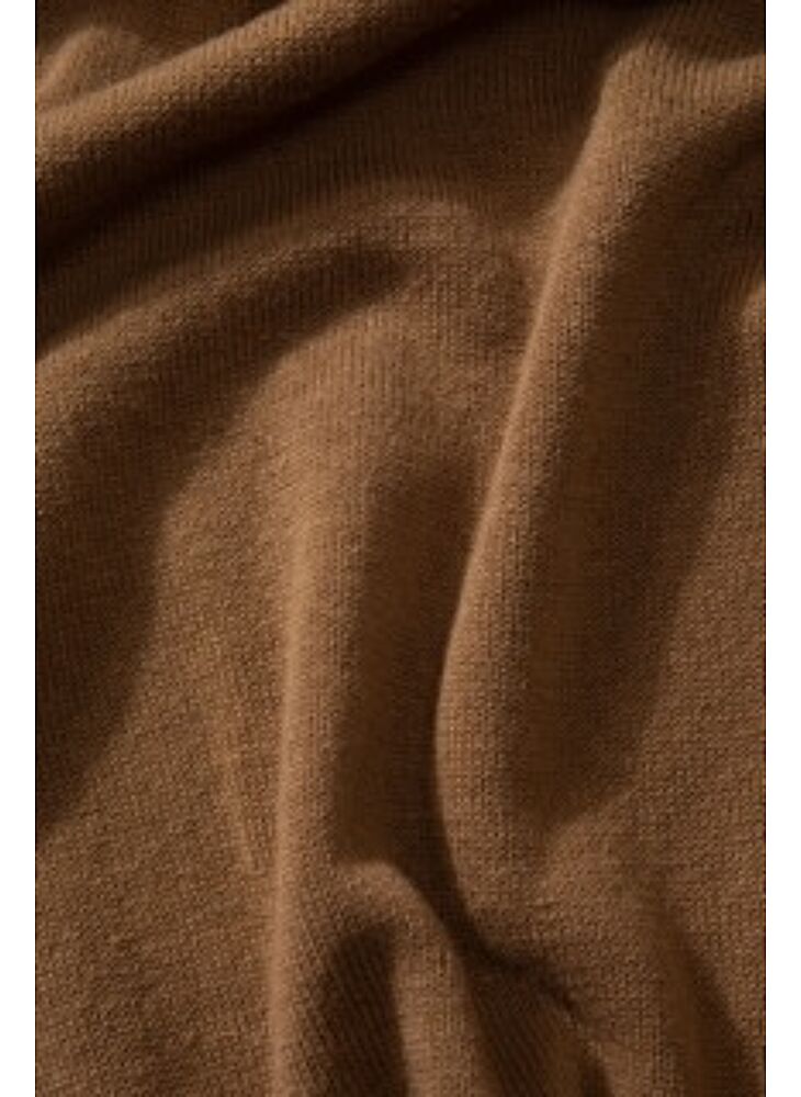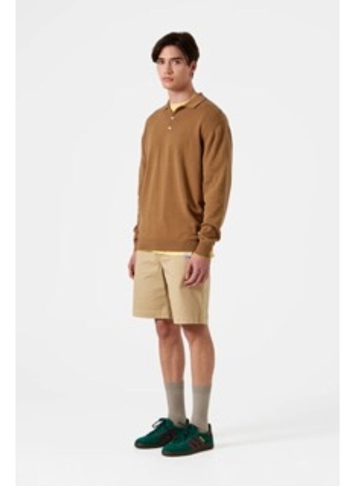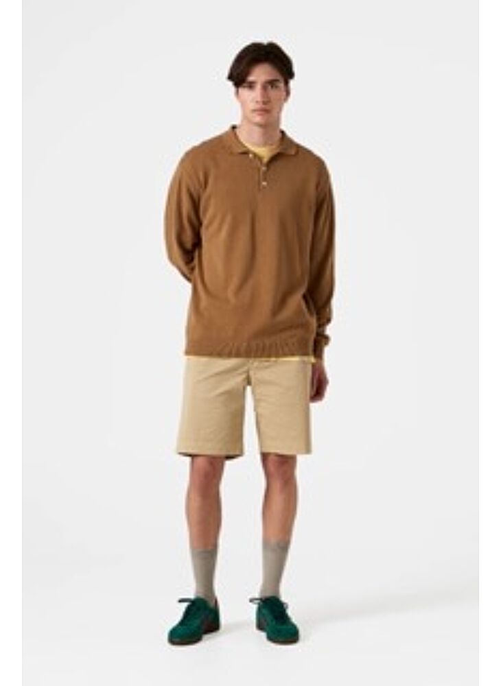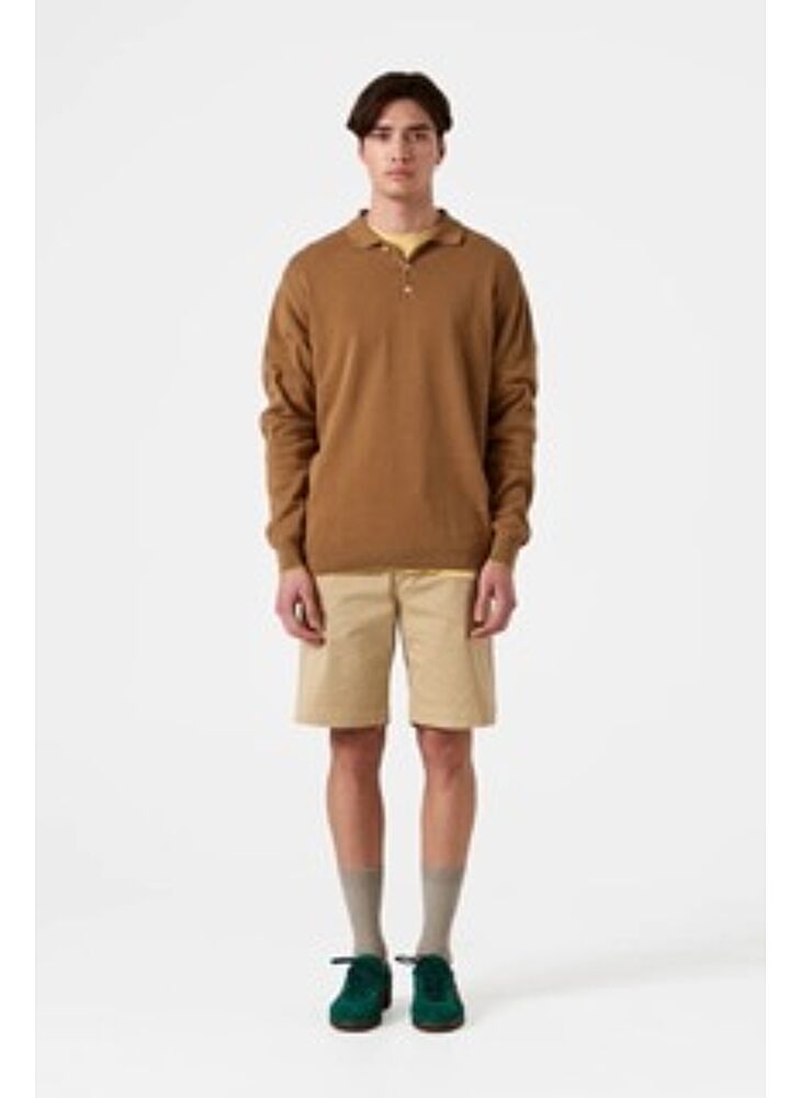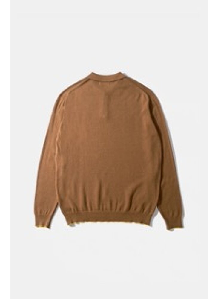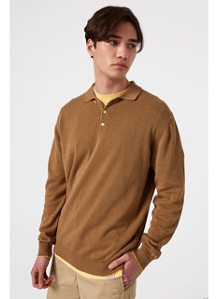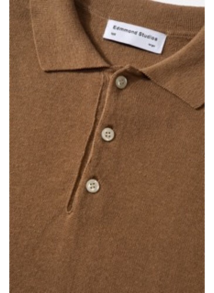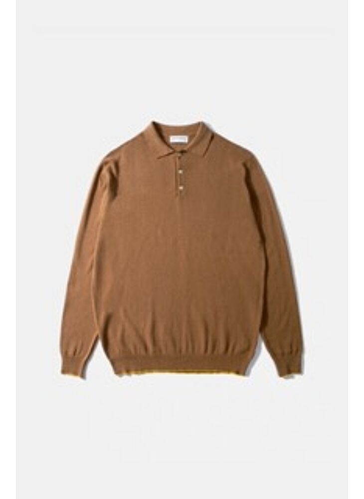 A knitted polo with long sleeves and buttoned shirt collar in brown. It has three buttons under the collar and a smooth and soft design, which extends to the hem and sleeve cuffs, where a ribbed fabric can be seen. Completed with a yellow stripe at the bottom of the garment.
