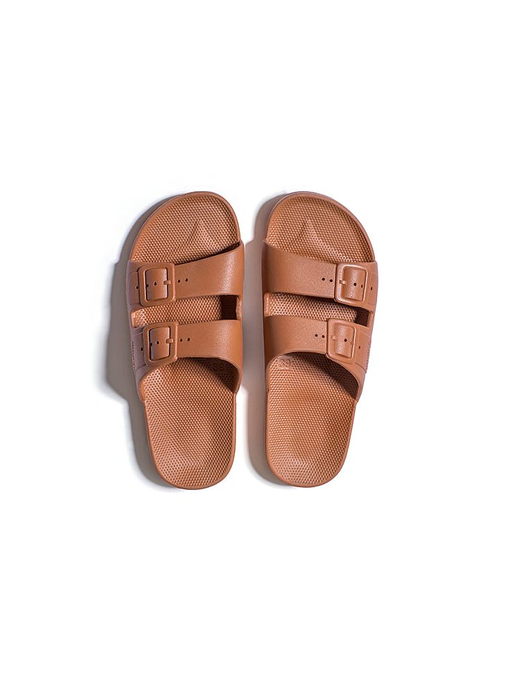 At Freedom Moses we're all about celebrating summer 365 days a year. From am to pm, our TOFFEE vegan slides are injected with air so you feel like you’re walking on a cloud. Whether chilling at the beach or just hanging out, we’re also available for your whole crew, from kids slides to women's slides and men’s slides, if you’re into prints, glitters, metallics or basic colors we’ve got you covered.