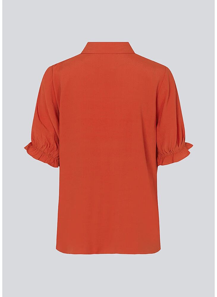 Red shirt with short puff sleeves with elasticated trim. RavenMD print shirt has a normal collar and buttons on front. The fit is relaxed. The model is 173 cm and wears a size S/36