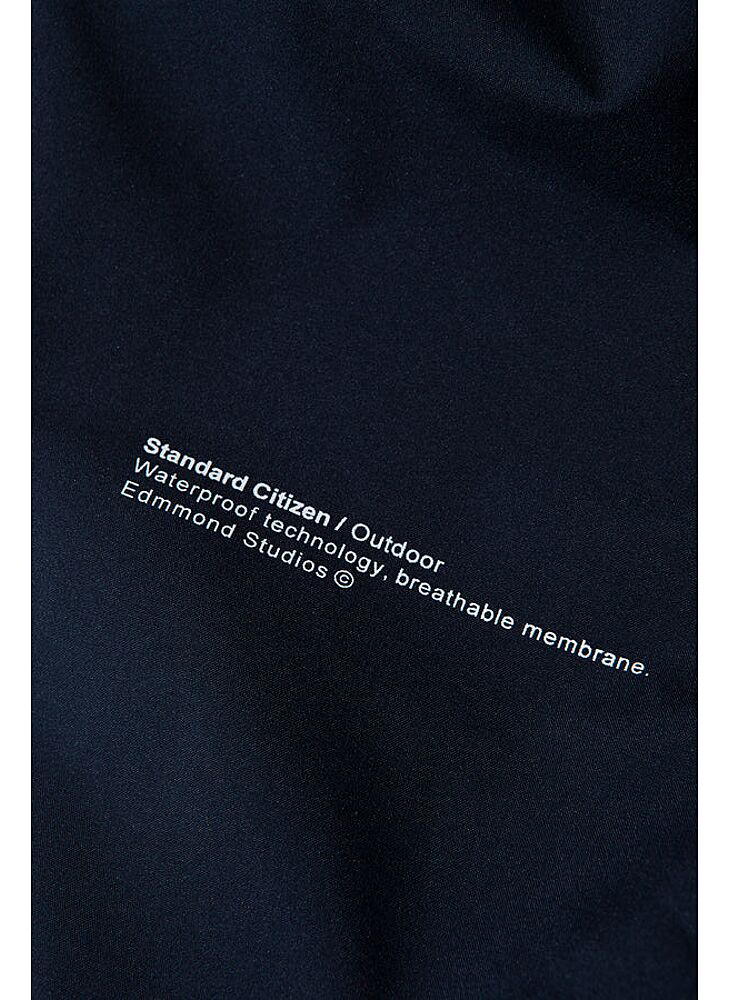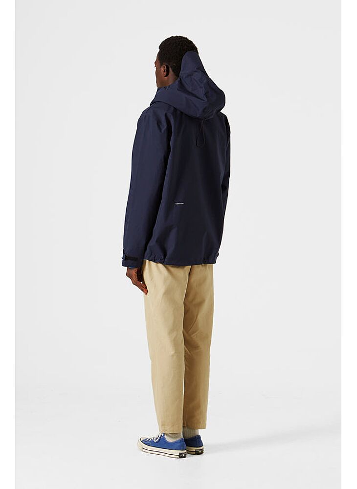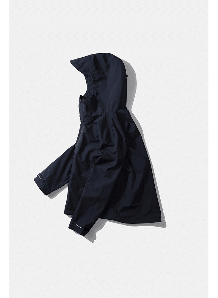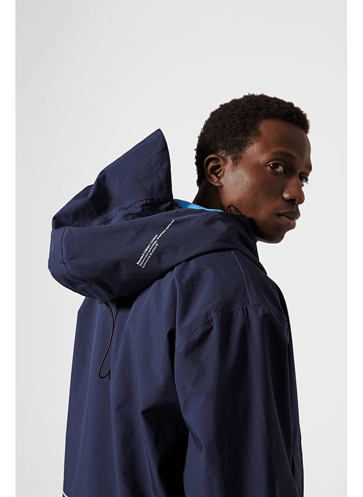 A dark blue jacket with hood, outside pockets oriented diagonally, a black zipper that serves to open it and give it a more sporty style. It also has a magic zipper adjustment on the sleeves.